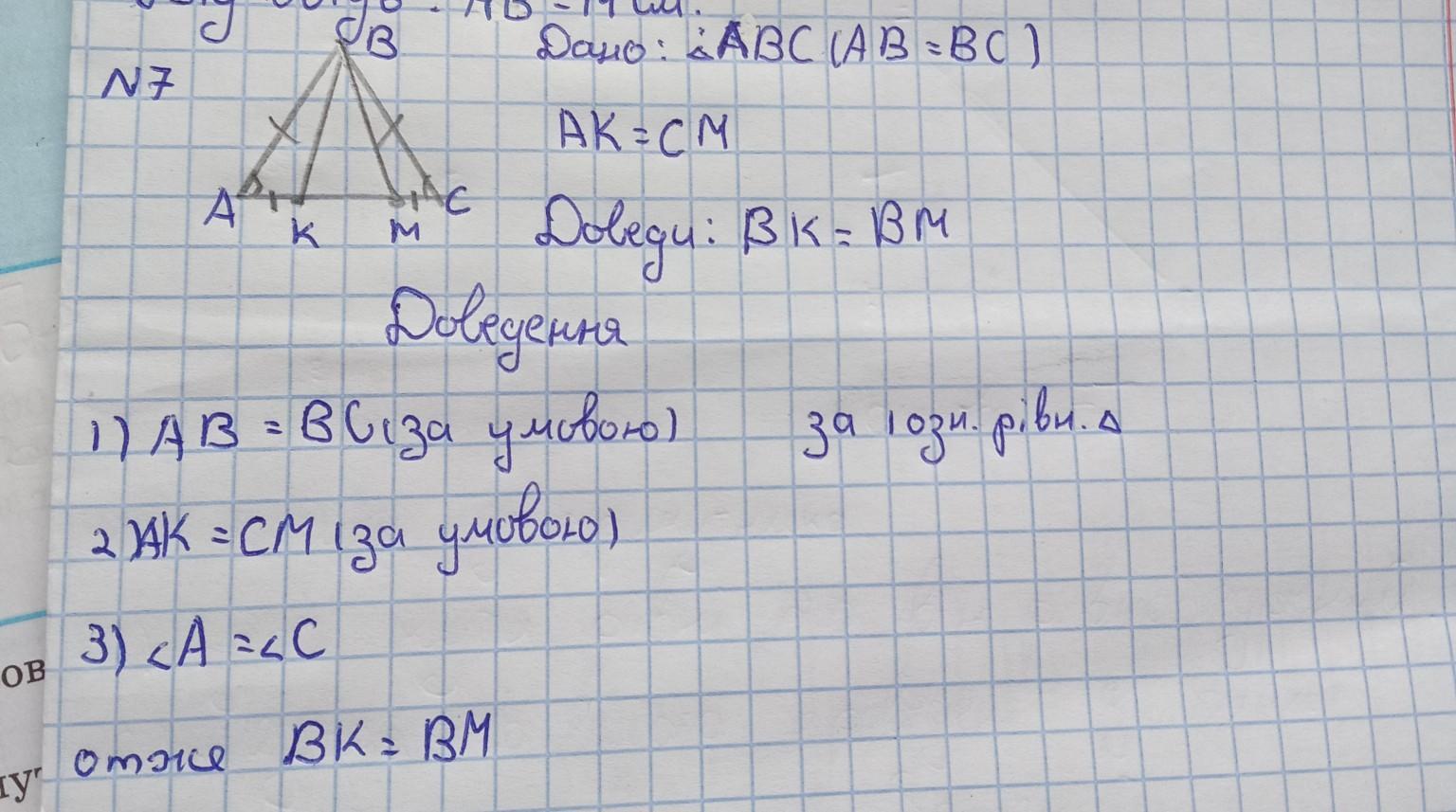 на основі AC рівнобедреного трикутника ABC узяти точку K та M так,що AK=CM доведи,що BK=BM