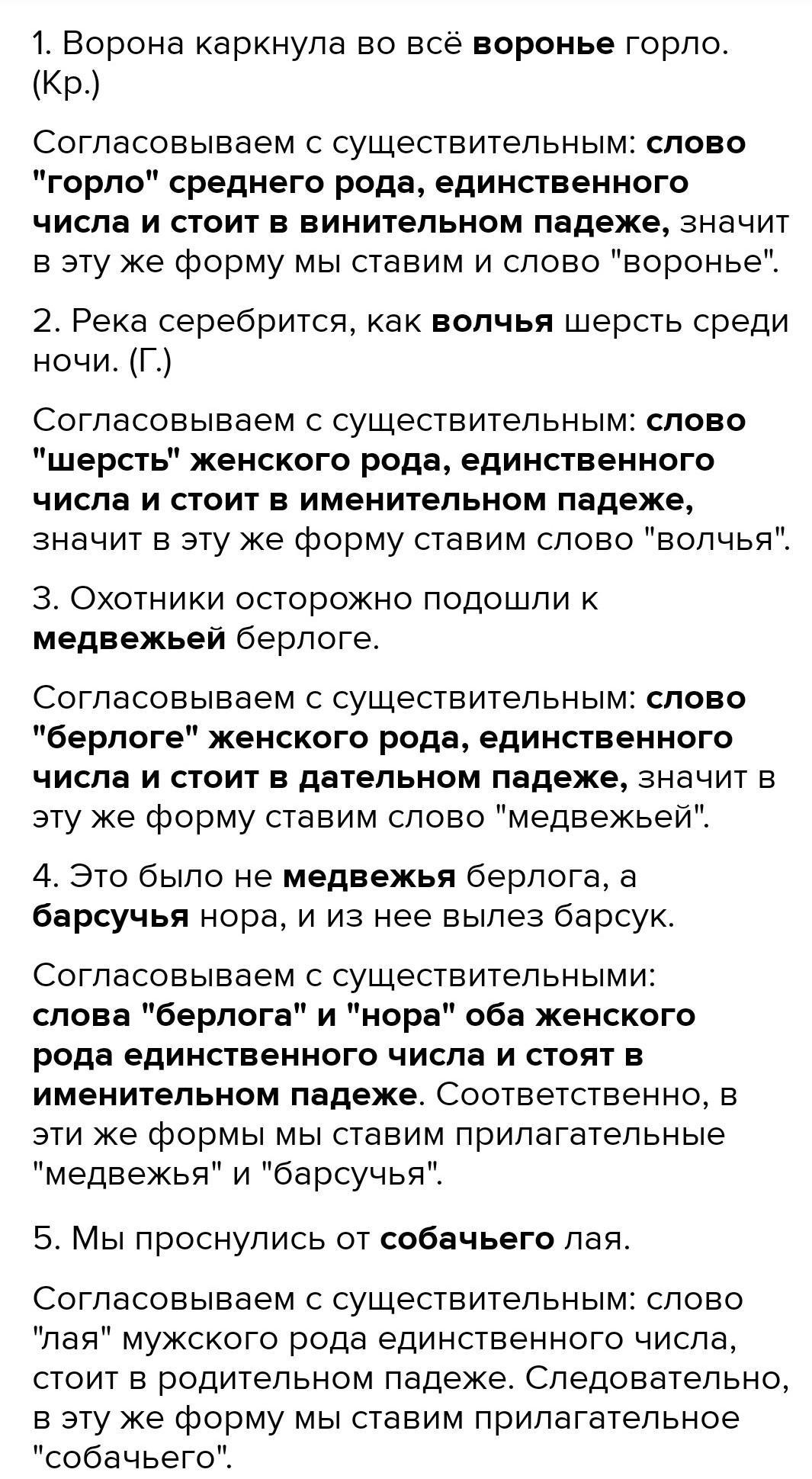 Упражнение 265, Спишите, согласуя прилагательные с существительными, которым они относятся. Укажите род, число и падеж прилагательных. 1. Ворона каркнула во всё (вороний) горло. (Кр.) 2. Река серебрится, как (волчий) шерсть среди ночи. (Г.) 3. Охотники осторожно подошли к (медвежий) берлоге. 4. Это была не (медвежий) берлога, а (барсучий) нора, и из неё вылез барсук. 5. Мы проснулись от (собачий) лая.
