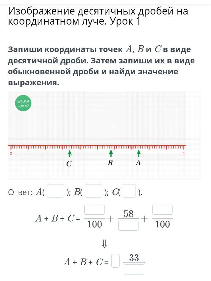 Изображение десятичных дробей на координатном луче. Урок 1 Запиши координаты точек A, B и C в виде десятичной дроби. Затем запиши их в виде обыкновенной дроби и найди значение выражения.
