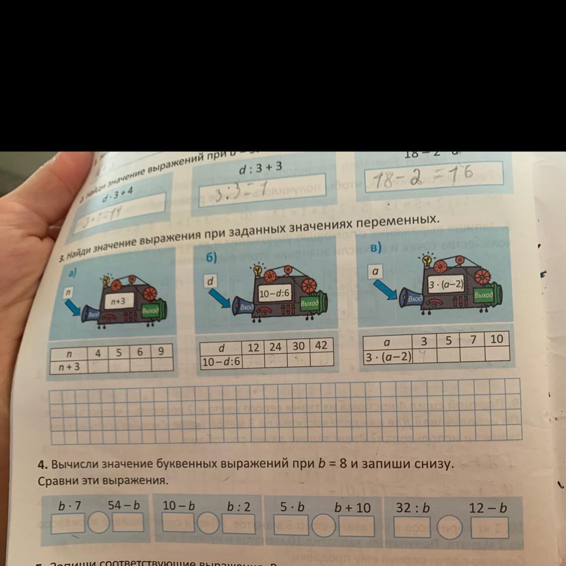 Пункт В) 3•(3-2)=3Ты сначала делаешь вычитание в скобках потом умнажение 3•(5-2)=9|3•(7-2)=15|3•(10-2)=24
