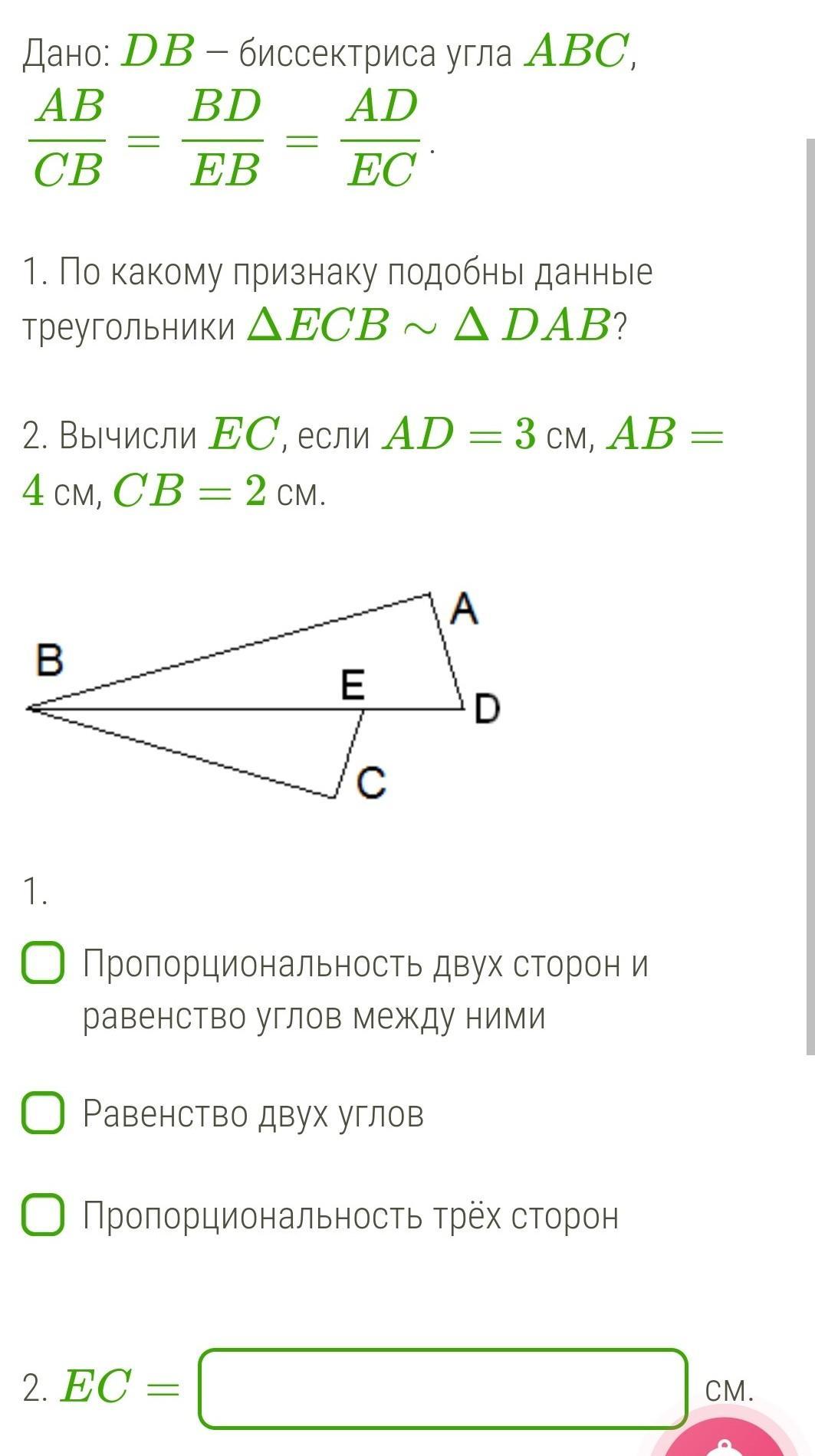 EC = ( CB *AD )/AB = ( 2 * 3 )/6 = 1,5 ( см ) ; ЕС = 1,5 см .