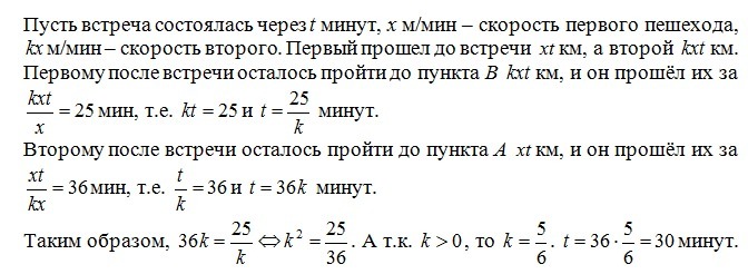 два пешехода вышли одновременно навстречу друг другу из двух сел A и B. первый прибыл в B через 25 минпосле встречи, а второй прибыл в A через 36 мин после встречи. через сколько минут после своего выхода пешеходы втретились?