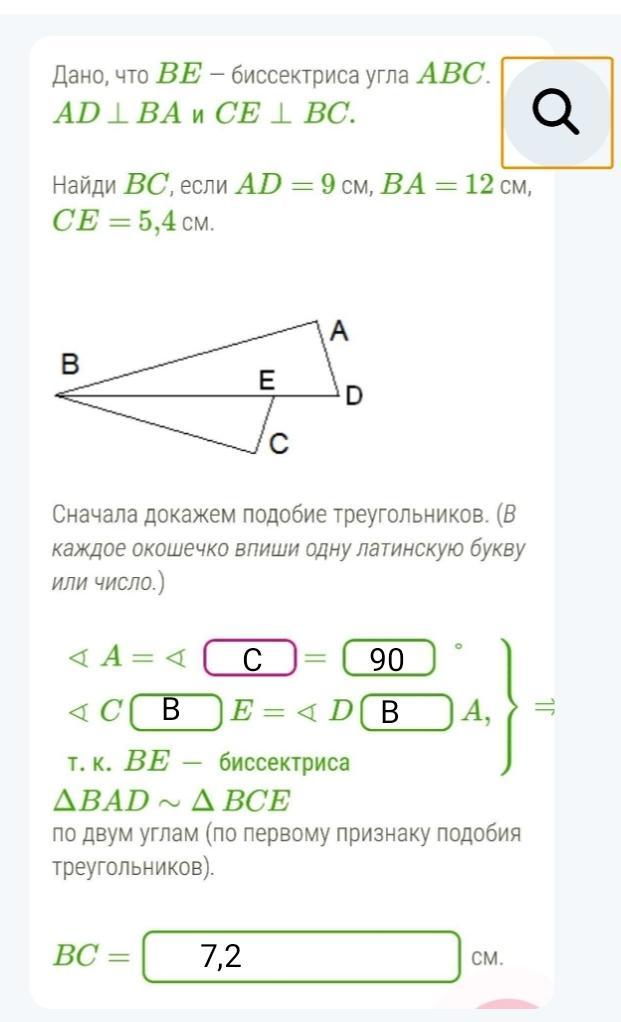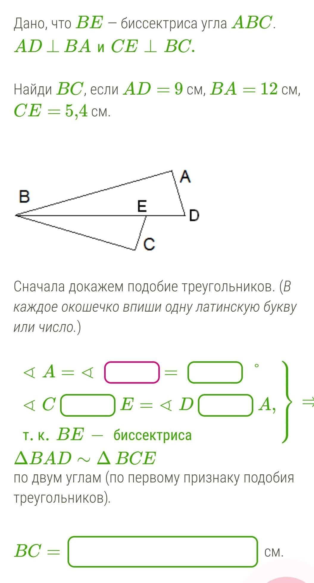 BC=AB*CE/AD=12*5,4/9=7,2см