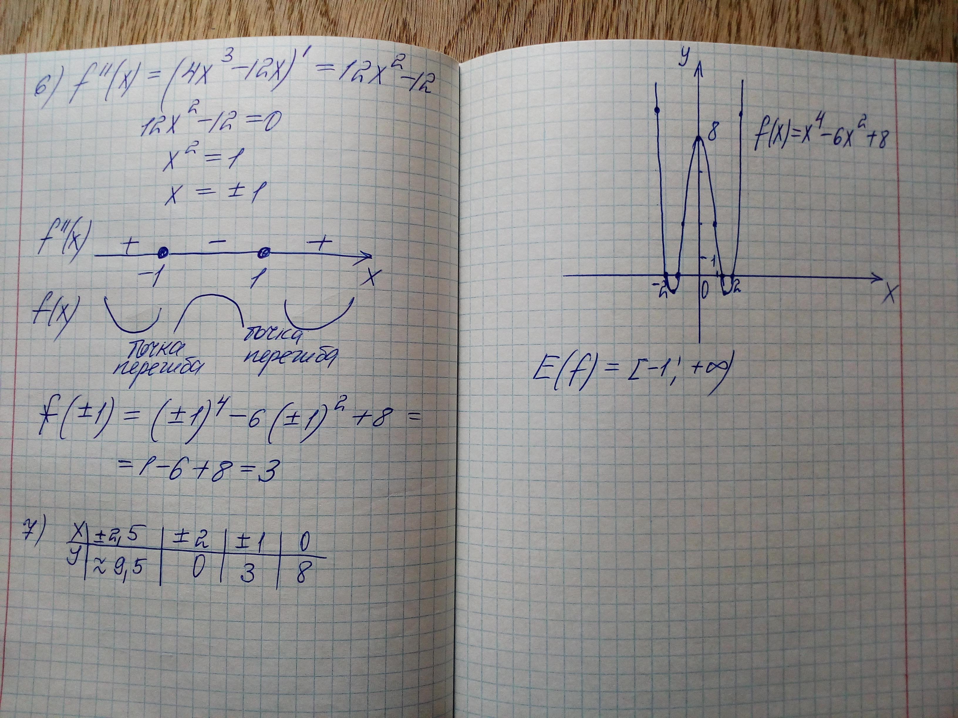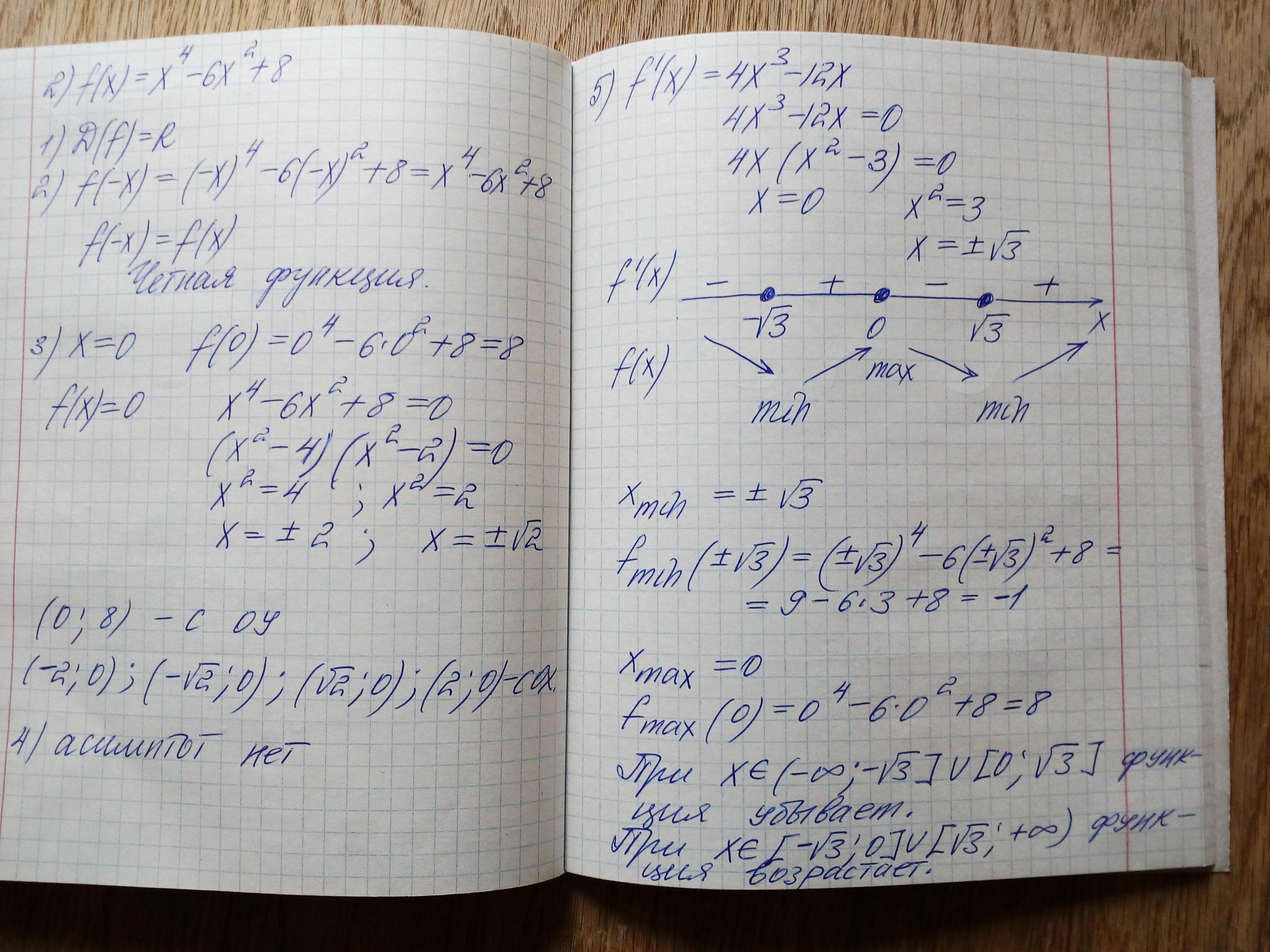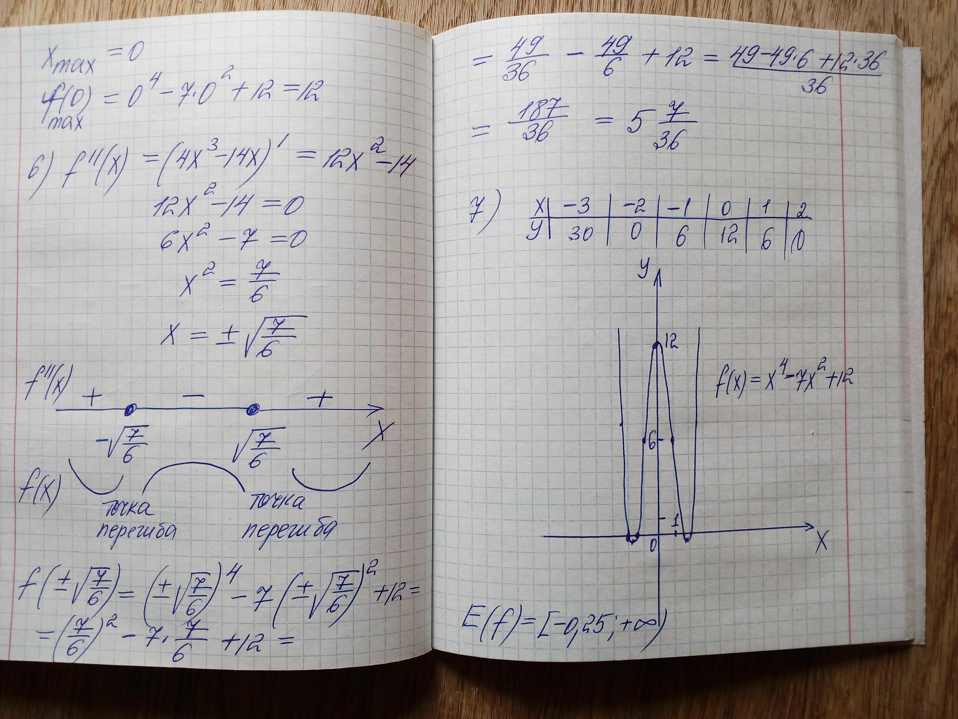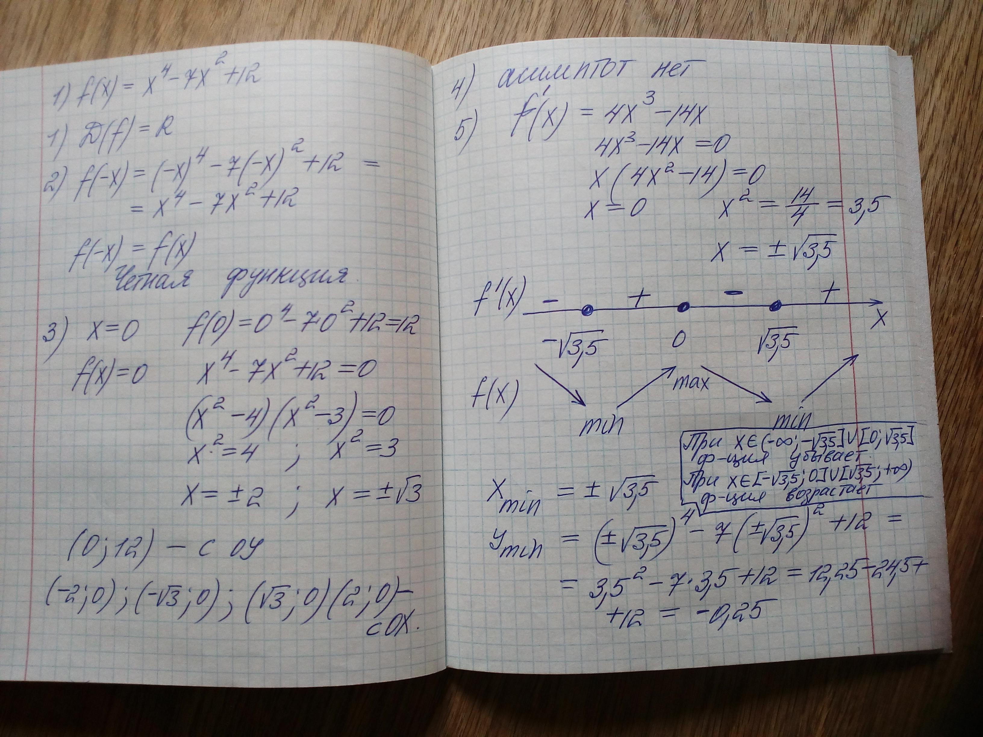 ПОМОГИТЕ ПОЖАЛУЙСТА СРОЧНО НУЖНО ПРОШУ!!! Исследовать функцию и построить график: 1)f(x)=х4-7х2+12