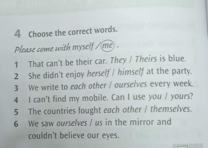 Ответ:1 Theirs, 2herself,3 each other ,4 yours,5each other,6 ourselves .