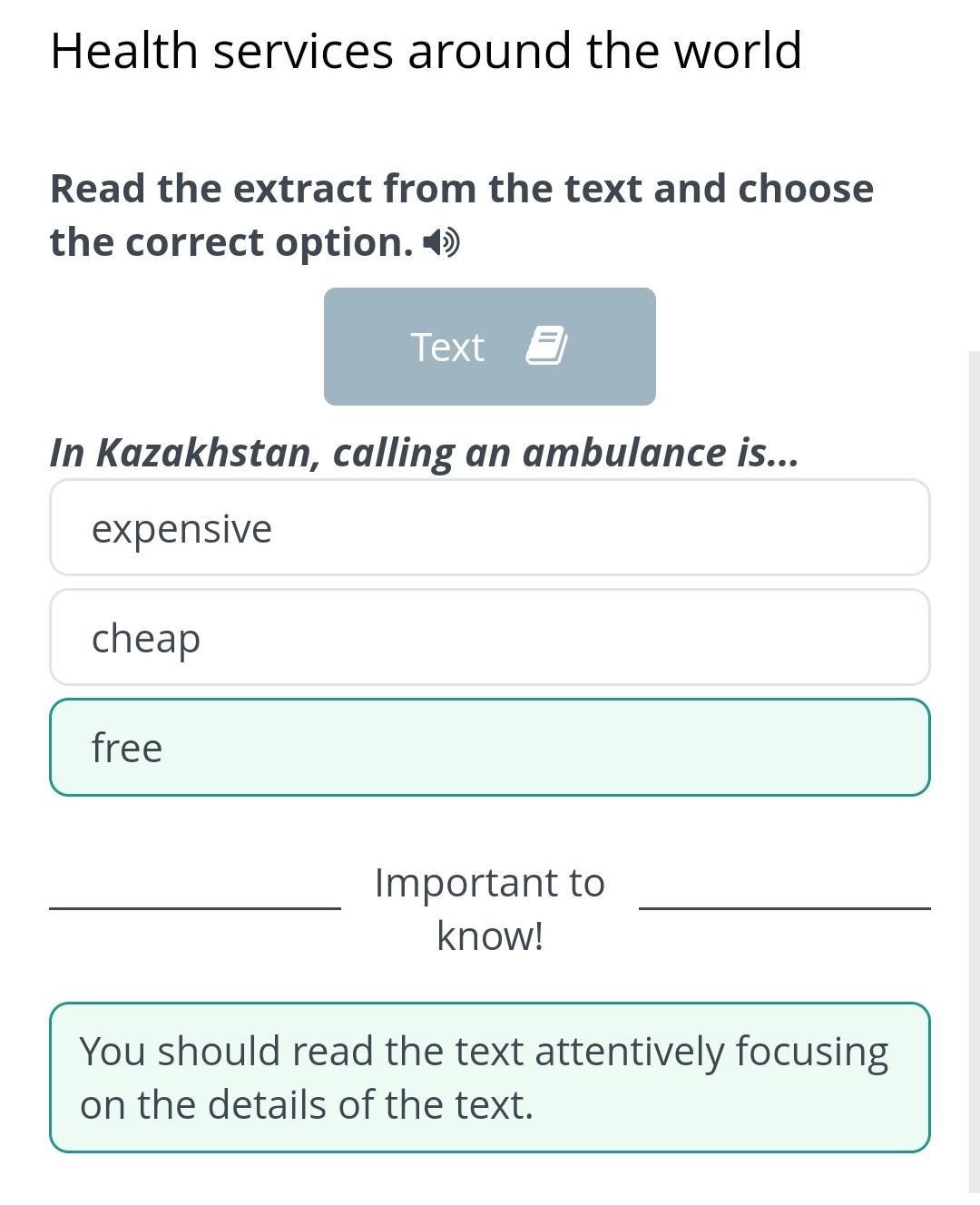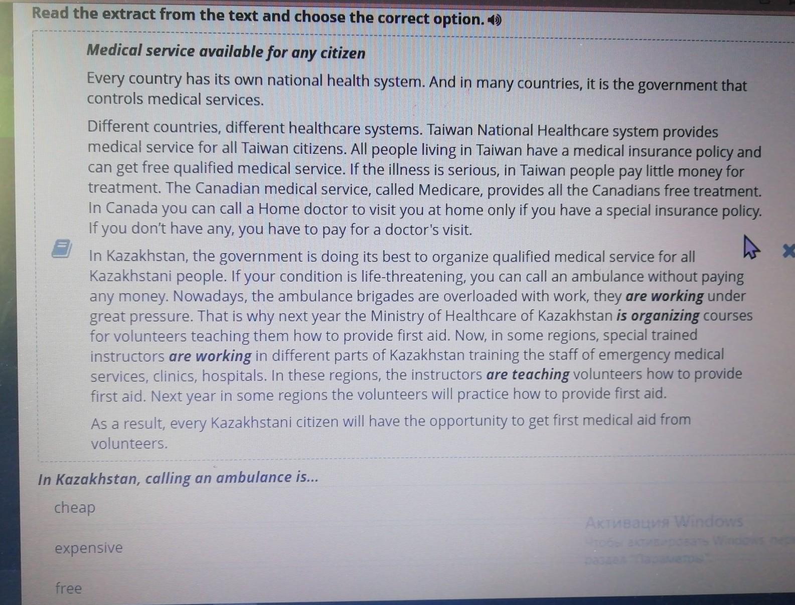Health services around the world Read the extract from the text and choose the correct option. 1) In Kazakhstan, calling an ambulance is...