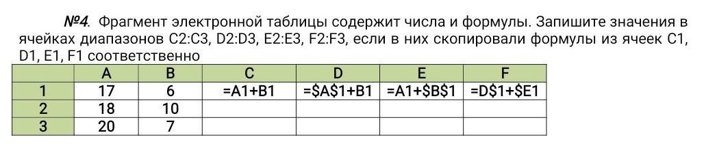 Фрагмент электронной таблицы содержит числа и формулы. Запишите значения в ячейках диапазонов C2:C3, D2:D3, E2:E3, F2:F3, если в них скопировали формулы из ячеек C1, D1, E1, F1 соответственно.