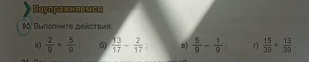 А) 2/9+5/9=7/9(если знаменательный одинаковый то он не меняется!) (считай просто как 2+5, но внизу приписывай общий знаменатель)