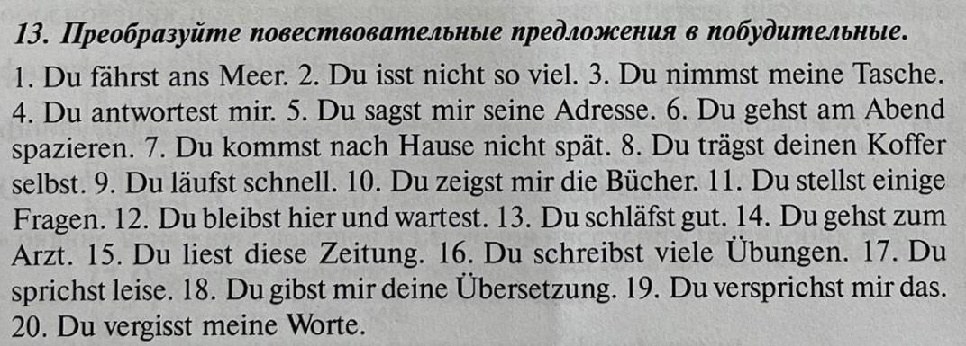 Ответ: 1 ) Fahren Sie zum Meer . 2) Iss nicht so viel . 3) Nehmen Sie miene Tasche nicht mit . 4) Antworte mir . 5) Sag mir siene Adresse . 6) Get abends spazieren. 7) Komm nicht zu spat (на букве а поставь 2 точки) nach Hause . 8) Tragen Sie Ihren Koffer selbst. 9) Schnell laufen . 10) Zeig mir die Bucher (над буквой u поставь 2 точки ) . 11) Stellen Sie einige Fregen . 12) Bleib hier und warte . 13) Schlaf gut . 14) Du gehst mit mir zum Arzt . 15) Lies diese Zeitung. 16) Schreibe viel Ubung ( на букве u поставь 2 точки ) . 17) Sprich leise . 18) Gib mir deine Ubersetzung (на букве U поставь 2 точки ) . 19) Versprich es mir . 20) Vergiss meine Worte nicht.