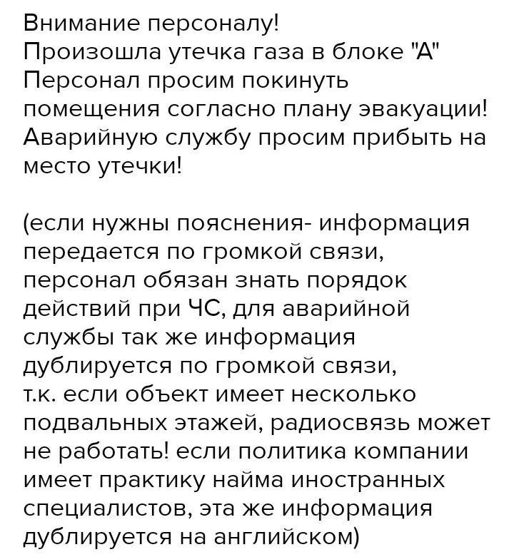 1. Составьте вариант возможной устной информации при возникновении аварийной ситуации на взрывопожароопасном обьекте