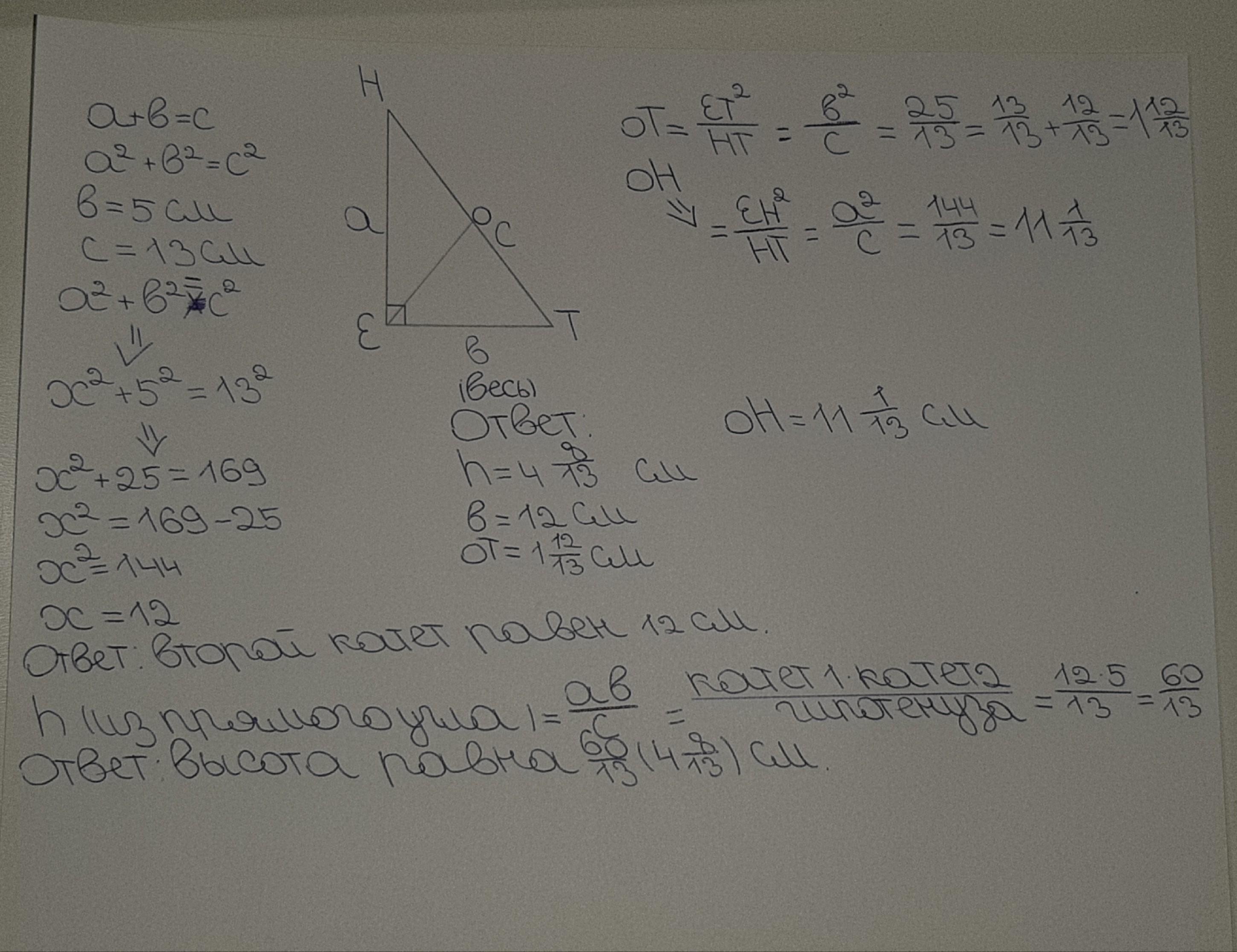Один из катетов прямоугольного треугольника равен 5см, а гипотенуза равна 13см. Найдите высоту, проведённую из вершины прямого угла, второй катет, и отрезки, на которые эта высота делит гипотенузу.
