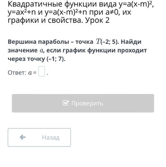 Вершина параболы – точка T(–2; 5). Найди значение a, если график функции проходит через точку (–1; 7).