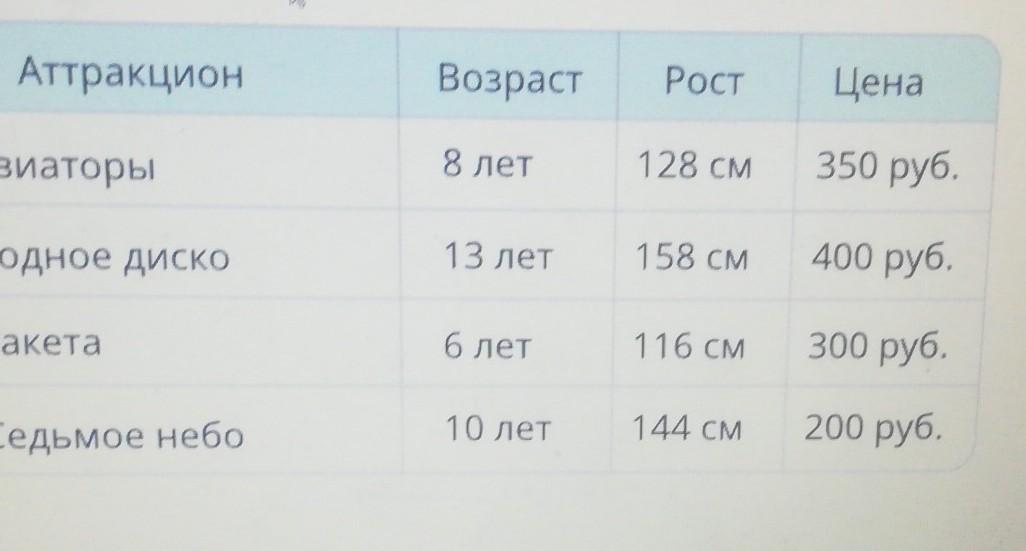 для каждого аттракциона в таблице указаны минимально доступный возраст и рост а также цена билета Миша 11 лет его рост составляет 141 см Сколько заплатят меньше за билеты если он хочет прокатиться на всех разрешённых аттракционах по одному разу?