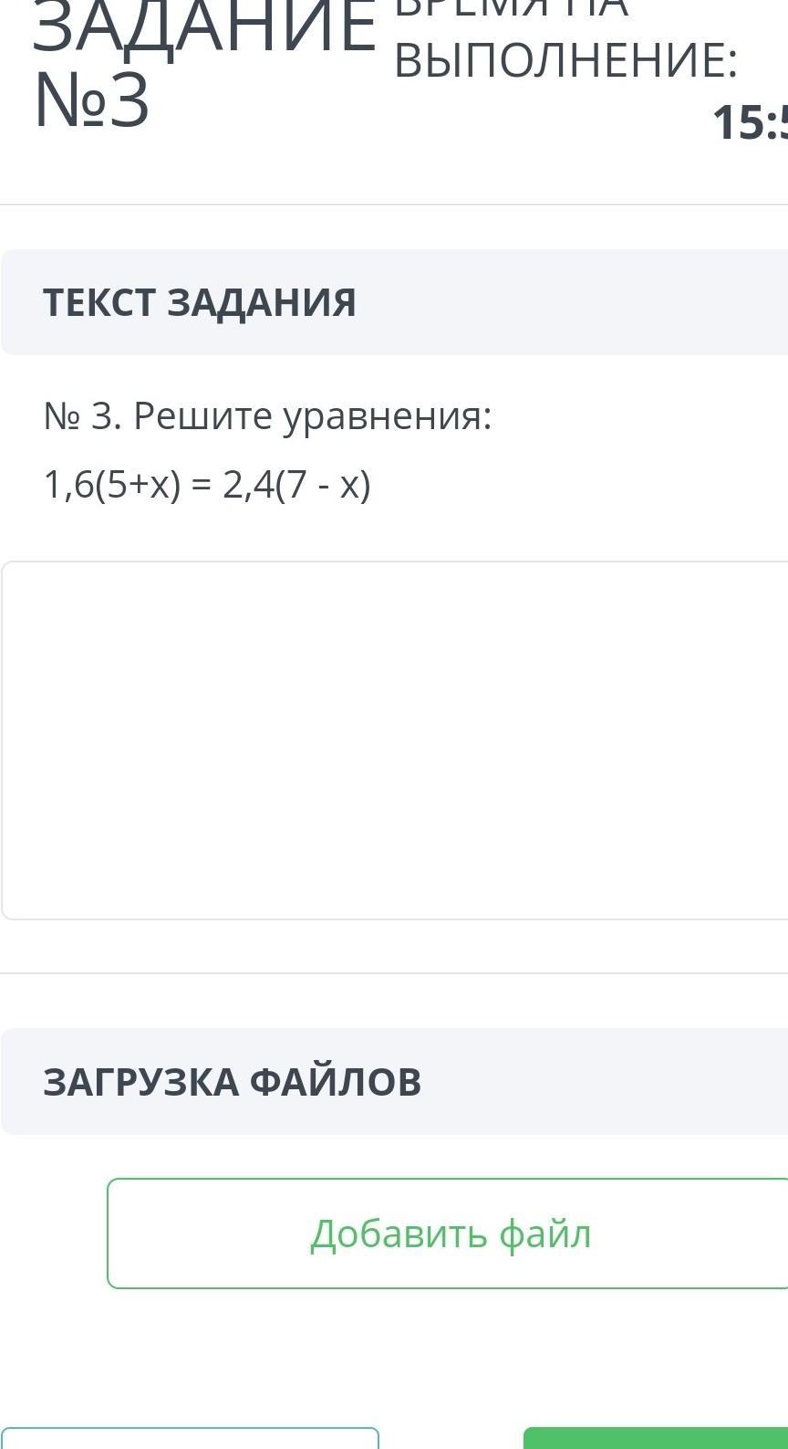 ЗАДАНИЕ №3 ВРЕМЯ НА ВЫПОЛНЕНИЕ: 14:48 ТЕКСТ ЗАДАНИЯ № 3. Решите уравнения: 1,6(5+х) = 2,4(7 - х) ЗАГРУЗКА ФАЙЛОВ Добавить файл Назад Вперед