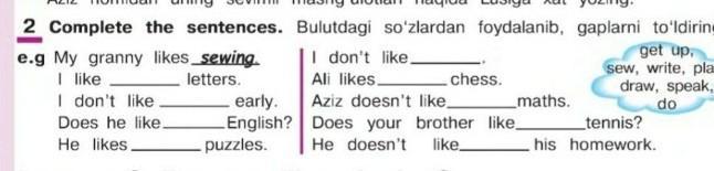 complete the sentences. написать предложения используя слова с облака (write, get up, sew, play, draw, speak, do)