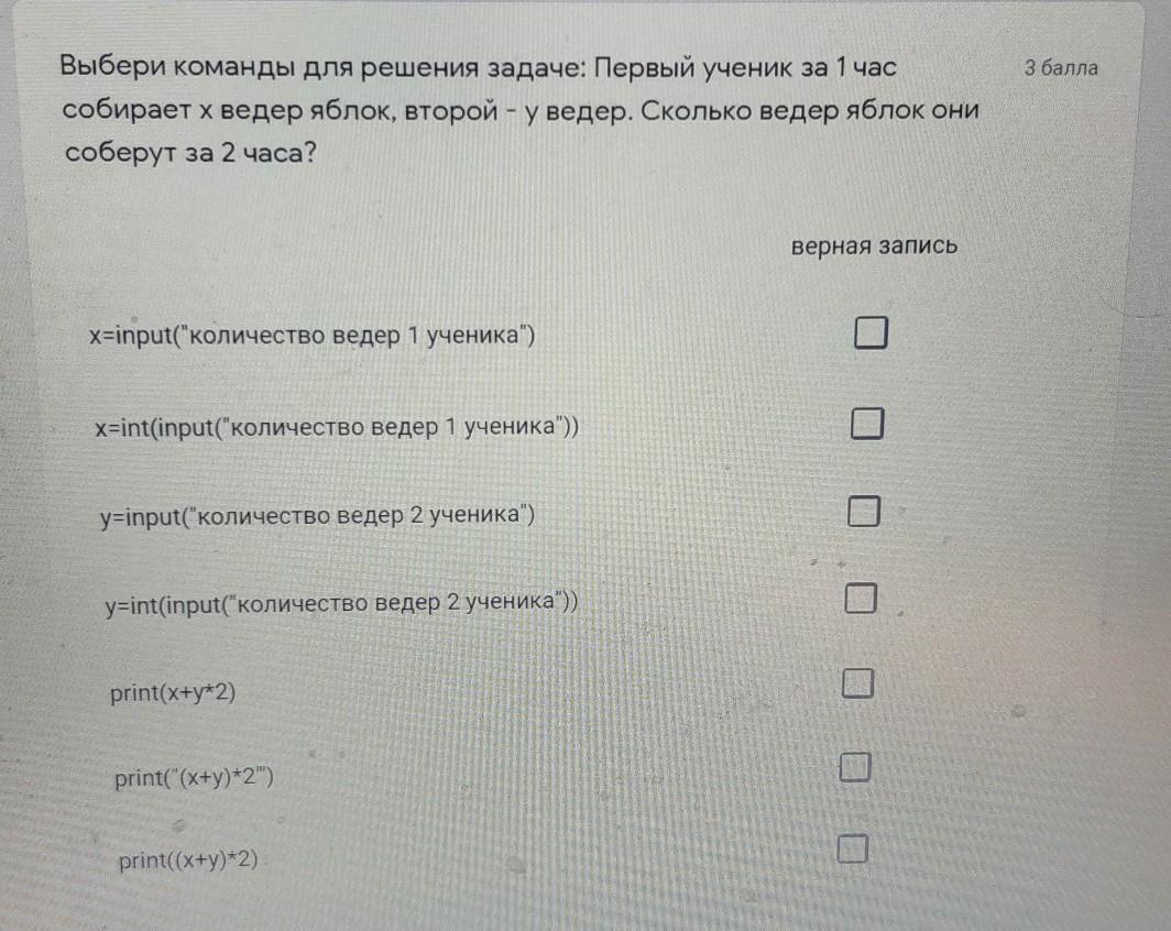 выбери команды для решения задачи: первый ученик за один час собирает x вёдер яблок, второй-y вёдер. сколько вёдер они соберут за 2 часа?