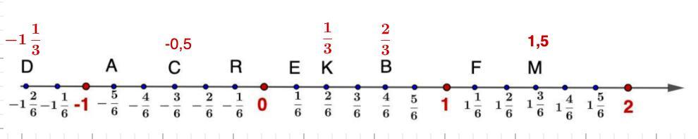 2)Приняв за единичный отрезок длину 6 клеток тетради, начертите координатную прямую и отметьте на ней точни K(1/3; C(-0.5); d(-1 1/3); e(1/6) f(1 1/6) A(-5/6) B(2/3 R(-1/6) M(1.5)