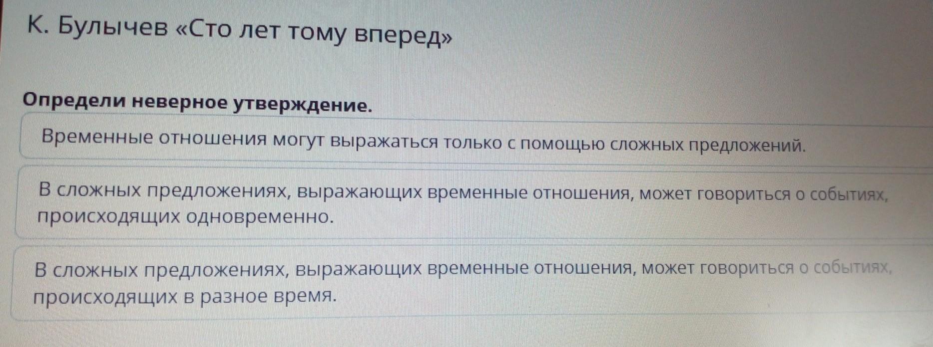К. Булычев «Сто лет тому вперед» Определи неверное утверждение. Временные отношения могут выражаться только с помощью сложных предложений. В сложных предложениях, выражающих временные отношения, может говориться о событиях, происходящих одновременно. В сложных предложениях, выражающих временные отношения, может говориться о событиях, происходящих в разное время.