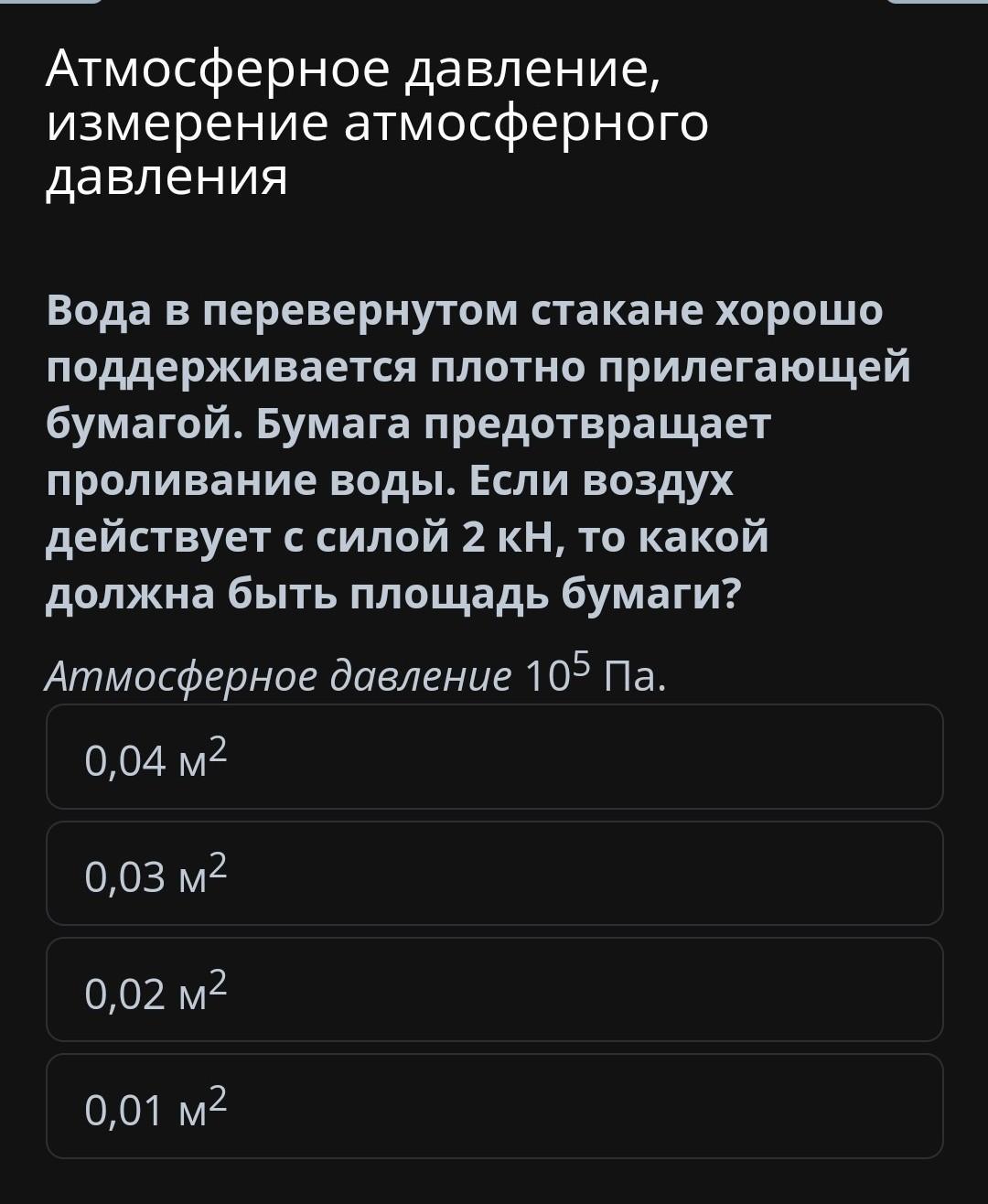 Вода в перевернутом стакане хорошо поддерживается плотно прилегающей бумагой. Бумага предотвращает проливание воды. Если воздух действует с силой 2 кн, то какой должна быть площадь бумаги? Атмосферное давление 10 ^ 5 * Pi * a . 0, 04M ^ 2 0, 03M ^ 2 0, 02M ^ 2 0, 01M ^ 2