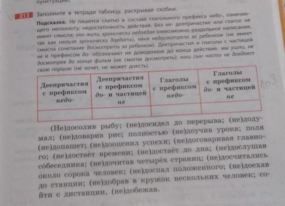 пунктуаци 213 Заполните в тетради таблицу, раскрывая скобки. Подсказка. Не пишется слитно в составе глагольного префикса недо-, означаю- щего неполноту, недостаточность действия. Без не- деепричастие или глагол не имеет смысла: они жили, хронически недоедая (невозможно раздельное написание, так как нельзя хронически доедать), няня недосмотрела за ребенком (не имеет смысла сочетание досмотреть за ребенком). Деепричастия и глаголы с частицей не и префиксом до- обозначают не доведенное до конца действие. мы ушли, не досмотрев до конца фильм (не смогли досмотреть); наш сын часто не доедает свою порцию (не хочет, не может доесть). Деепричастия Глаголы Деепричастия Глаголы с префиксом е префиксом с префиксом до- и частицей с префиксом недо- до- и частицей недо- He He (Не)досолив рыбу; (не)досидел до перерыва; (не)доду- мал; (не)доварив рис; полностью (не)доучив урока; поля (не)допашет; (не)дооценил успехи; (не)договаривая главно- го; (не)достаёт времени; (не)достаёт до дна; (не)дослушав собеседника; (не)дочитав четырёх страниц; (не)досчитались около сорока человек; (не)доспал положенного; (не)доехав до станции; (не)добрав в кружок нескольких человек; co- йти с дистанции, (не)добежав.