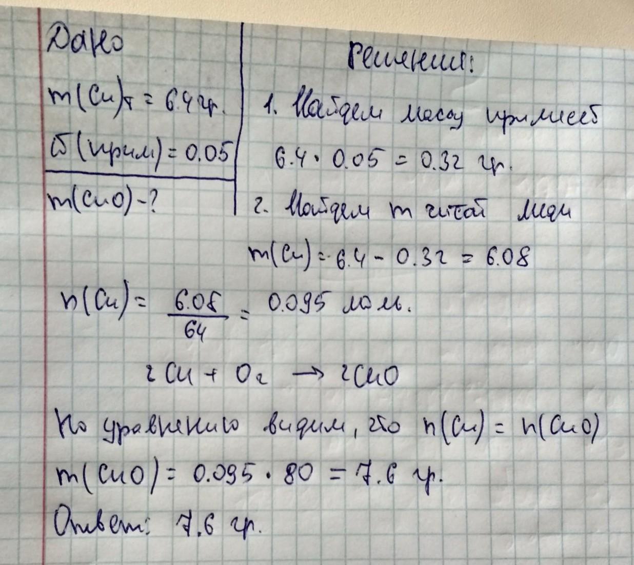 6.4г технической меди, содержащей 5% примеси, вступили в реакцию с кислородом. Определить массу образовавшегося оксида меди.