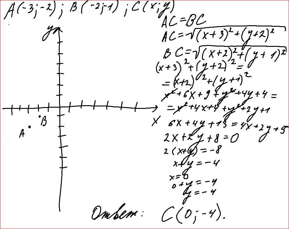 две точки заданы координатами на координатной плоскости (-3; -2) (-2; -1) найди координаты точки равно удалённой от заданных и принадлежащий оси ординат