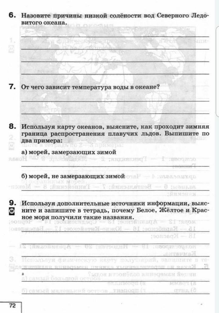 9) Используя дополнительные источники информации, выясните и запишите в тетрадь, почему Белое, Жёлтое и Красное моря получили такие названия Белое море длительное время покрыто льдами. Красное море - в мифах многих стран стороны горизонта имели разные цвета. У народов Азии красный цвет символизировал юг, то есть «море на юге». Также существует предположение, что название моря произошло от цвета водорослей, которые существуют в этом море. Желтое море -реки, которые впадают в это море несут много ила желтого цвета.