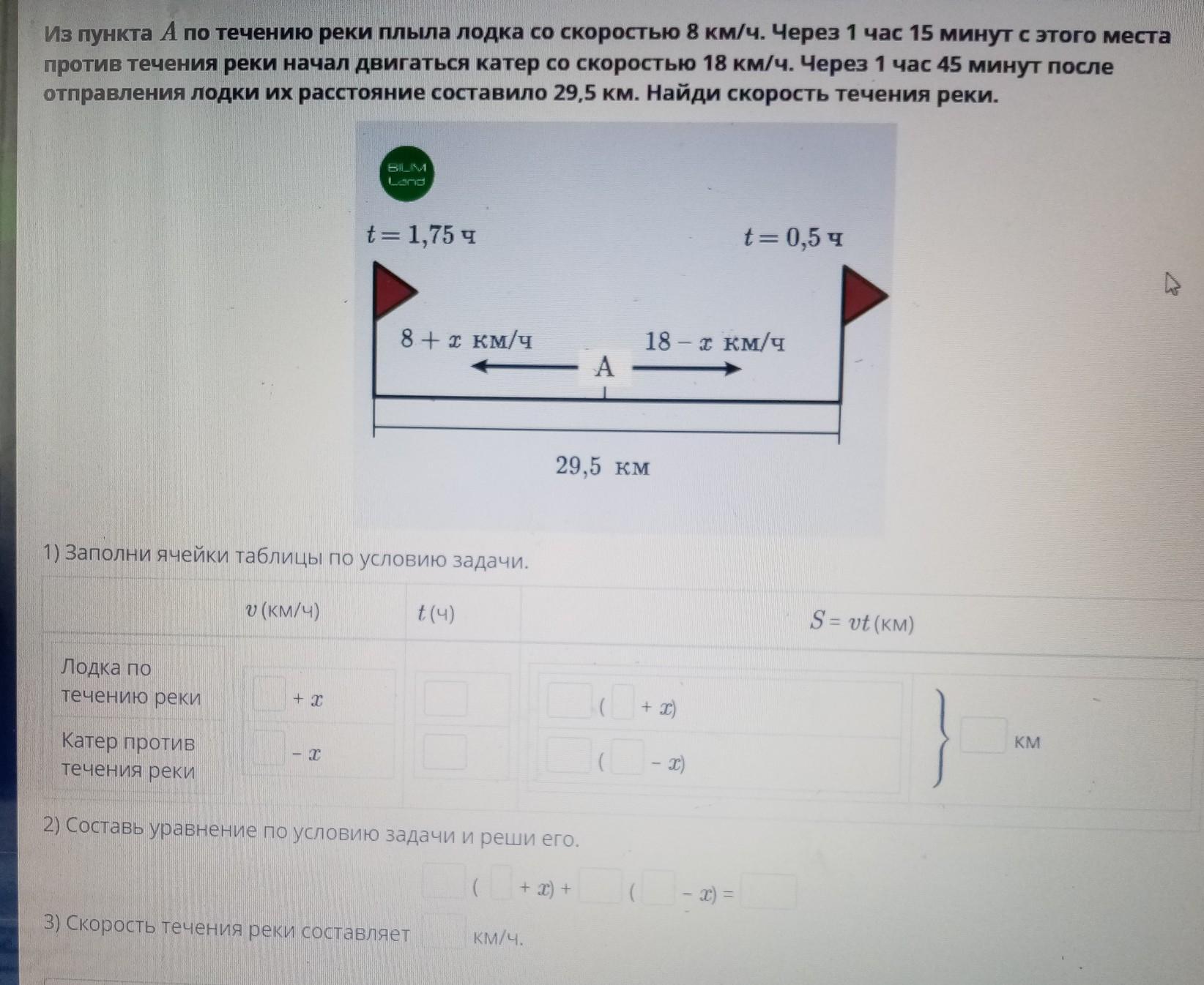 Решение текстовых задач с помощью уравнений. Урок 4 Из пункта А по течению реки плыла лодка со скоростью 8 км/ч. Через 1 час 15 минут с этого места против течения реки начал двигаться катер со скоростью 18 км/ч. Через 1 час 45 минут после Отправления лодки их расстояние составило 29,5 км. Найди скорость течения реки.
