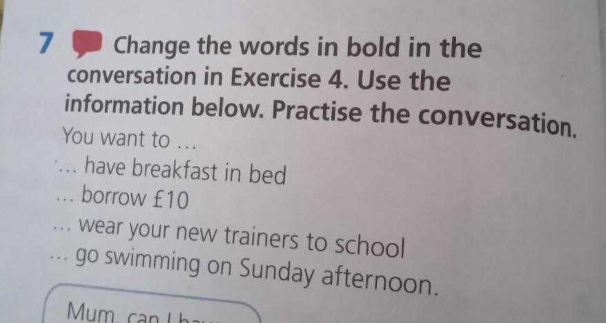 7 Change the words in bold in the conversation in Exercise 4. Use the information below. Practise the conversation, You want to ... have breakfast in bed borrow £10 wear your new trainers to school go swimming on Sunday afternoon. даю 100 баллов