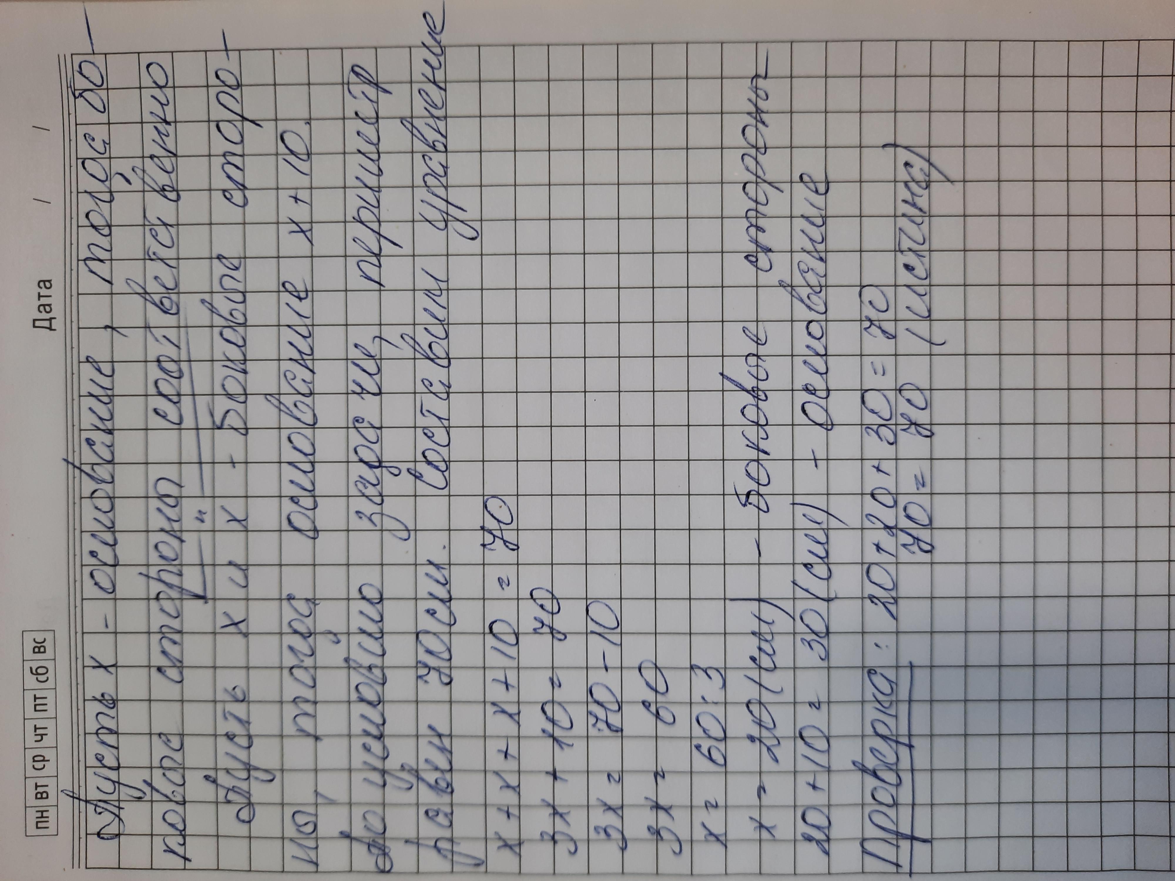 Периметр равнобедренного треугольника равен 70 см. найдите его основание, если боковая сторона на 10 см меньше основания этого треугольника