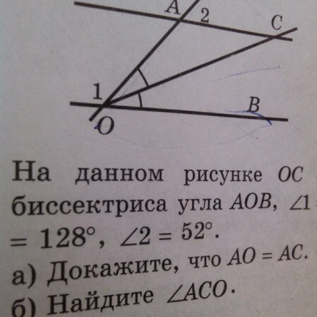 №1 угол2=уголАОВ=52 как соответственные, уголАОС=уголСОВ=уголАОС/2=52/2=26, уголСОВ=уголАСО как внутренние разносторонние=26, треугольник АОС равнобедренный, АС=АО, №3 КН=МР, КН параллельно МР, треугольник КОН =треугольник РОМ, по стороне (КН=МР) и прилегающим двум углам (уголОРМ=уголОНК как внутренние разносторонние, уголРОМ=уголОКН как внутренние разносторонние), значит КО=МО, РО=НО, треугольник РОК=треугольнику НОМ по двум сторонам (КО=МО, РО=НО) и углу между ними уголКОР=уголНОМ как вертикальные), значит уголНМО=уголРКО -это внутренние разносторонние углы, а если при пересечении двух прямых третьей внутренние разносторонние углы равны то прямые параллельны, КР параллельна НМ №2 КВ перпендикулярна ВС, уголАВС=115, уголАВК=115-уголКВС=115-90=25, АД перпендикулярна продолжению ВС, уголВАД=уголАВК=25 как внутренние разносторонние, угол ВАК=36, треугольник АКВ, уголАВК=25 уголАКВ=180-36-25=119
