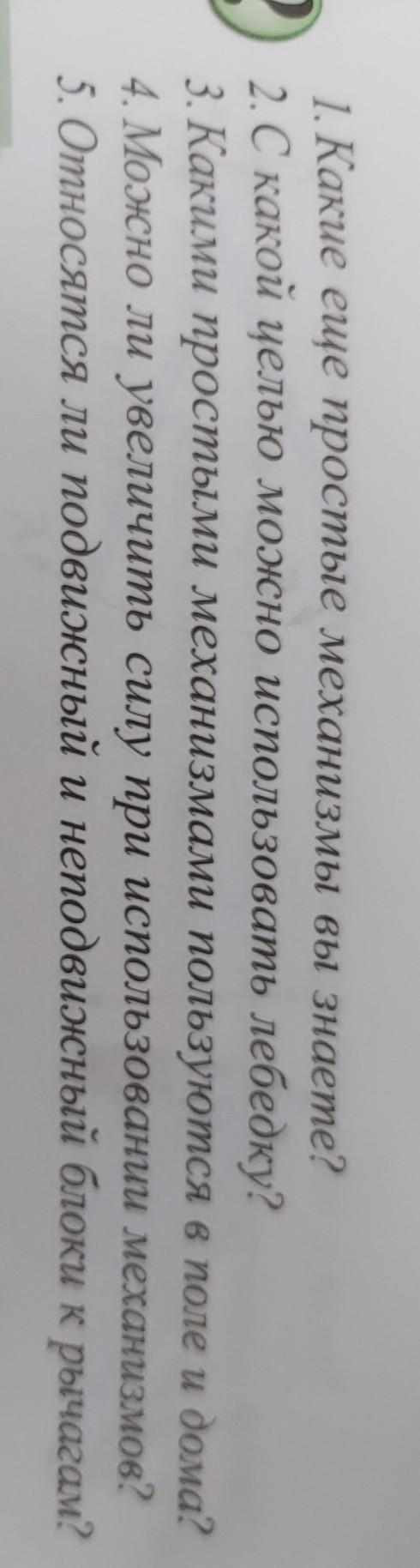 1. К простым механизмам относятся: наклонная плоскость, рычаг, блоки (подвижный и неподвижный), клин, винт, ворот.2. Лебедки используются для подтягивания грузов, поднятия автомобилей и вытаскивания их из непроходимых ям.3. К простым механизмам относится наклонная плоскость (клин, винт) и рычаг, ножницы (ворот, блок)4.Можно, если использовать неподвижный блок, подвесить к нему груз больше по силе тяжести, чем тот который нужно поднять.5.Неподвижный и подвижный блоки можно рассматривать как рычаги. Рычаг − это твёрдое тело, которое имеет ось вращения (точку опоры). Подвижный блок имеет разные плечи и даёт выигрыш в силе в 2 раза.Неподвижный блок равноплечий. Выигрыша в силе не даёт, но изменяет направление силы.