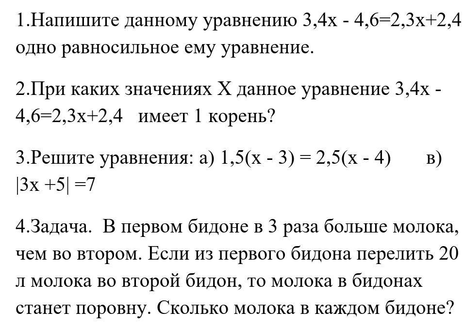 1. Напишите данному уравнению 3,4x - 4,6=2,3x+2,4 одно равносильное ему уравнение.