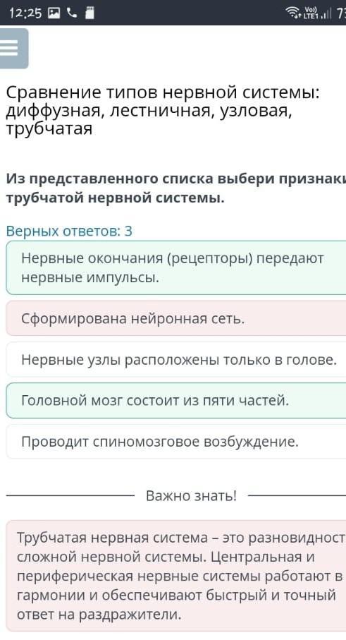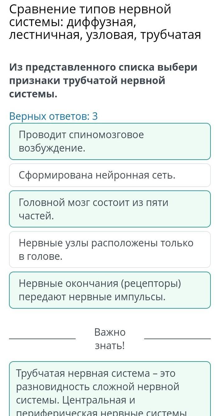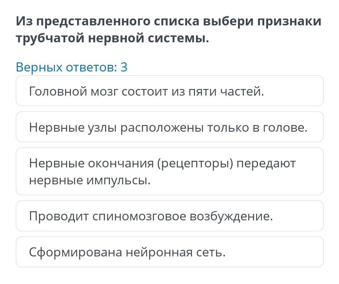 Из представленного списка выбери признаки трубчатой нервной системы. Верных ответов: 3 Головной мозг состоит из пяти частей. Нервные узлы расположены только в голове. Нервные окончания (рецепторы) передают нервные импульсы. Проводит спиномозговое возбуждение. Сформирована нейронная сеть.