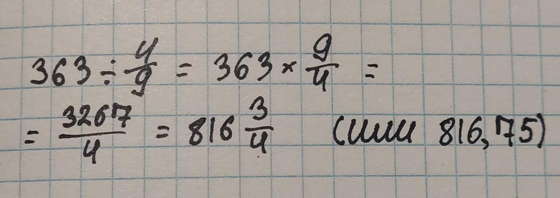 Пошаговое объяснение:363:4/9= 363х9/4=3267/4=816целых 3/4=816,75