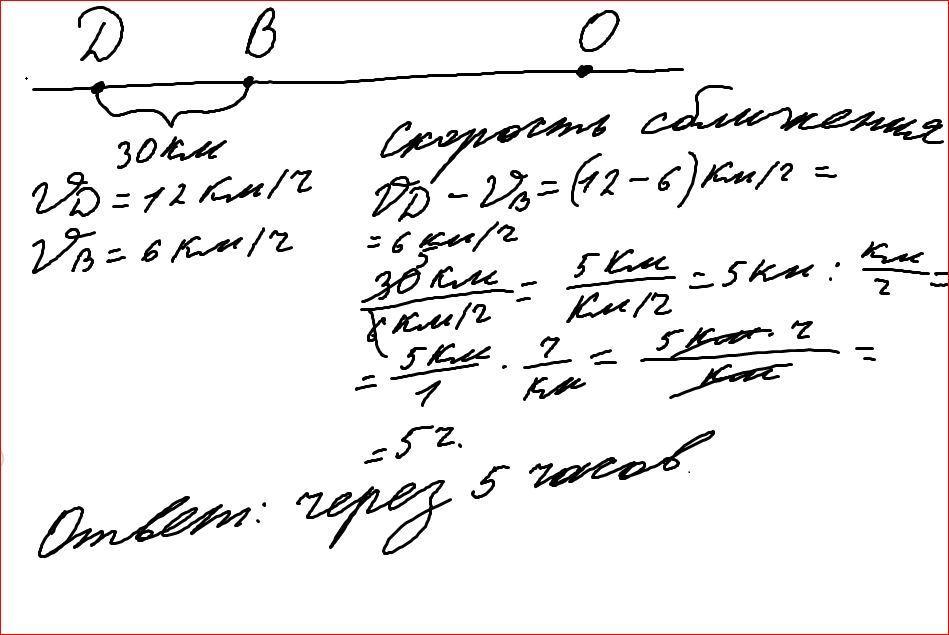 6) Из посёлков, находящихся на расстоянии 30 км, одновре- менно выехали два всадника в направлении озера. Скорость всадника, выехавшего из дальнего посёлка - 12 км/ч, а из ближ- него - 6 км/ч. Через какое время один всадник догонит другого? -