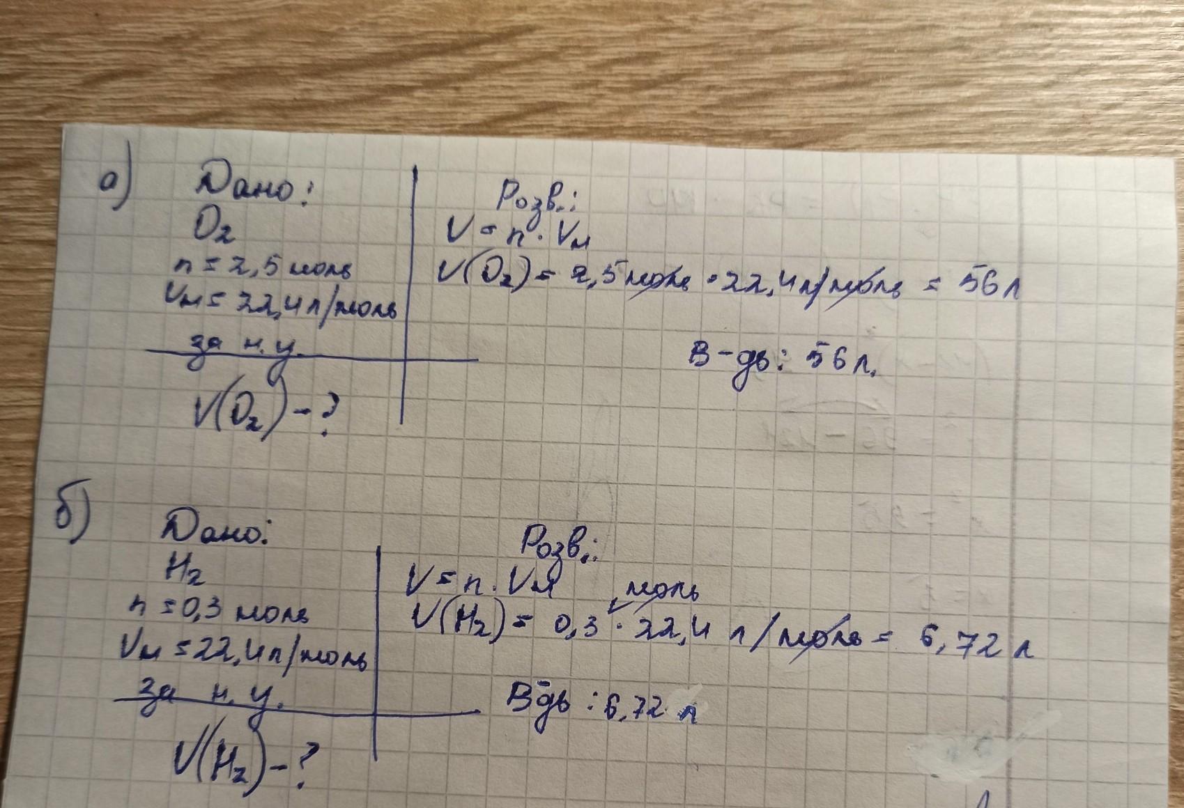 Обчисліть об'єм що займає за нормальних умов:а) кисень кількістю речовини 2,5 моль; б) водень кількістю речовини 0,3 моль.