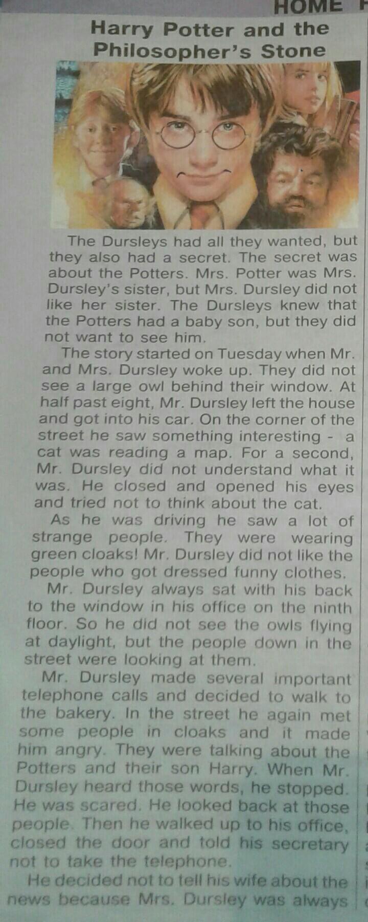 История началась во вторник, когда мистер и миссис Дурсли проснулись. Они не видели большую сову за своим окном. В половине восьмого мистер Дурсль вышел из дома и сел в свою машину. На углу улицы он увидел кое-что интересное — кот читал карту. На секунду мистер Дурсль не понял, что это было. Он закрывал и открывал глаза и старался не думать о кошке.