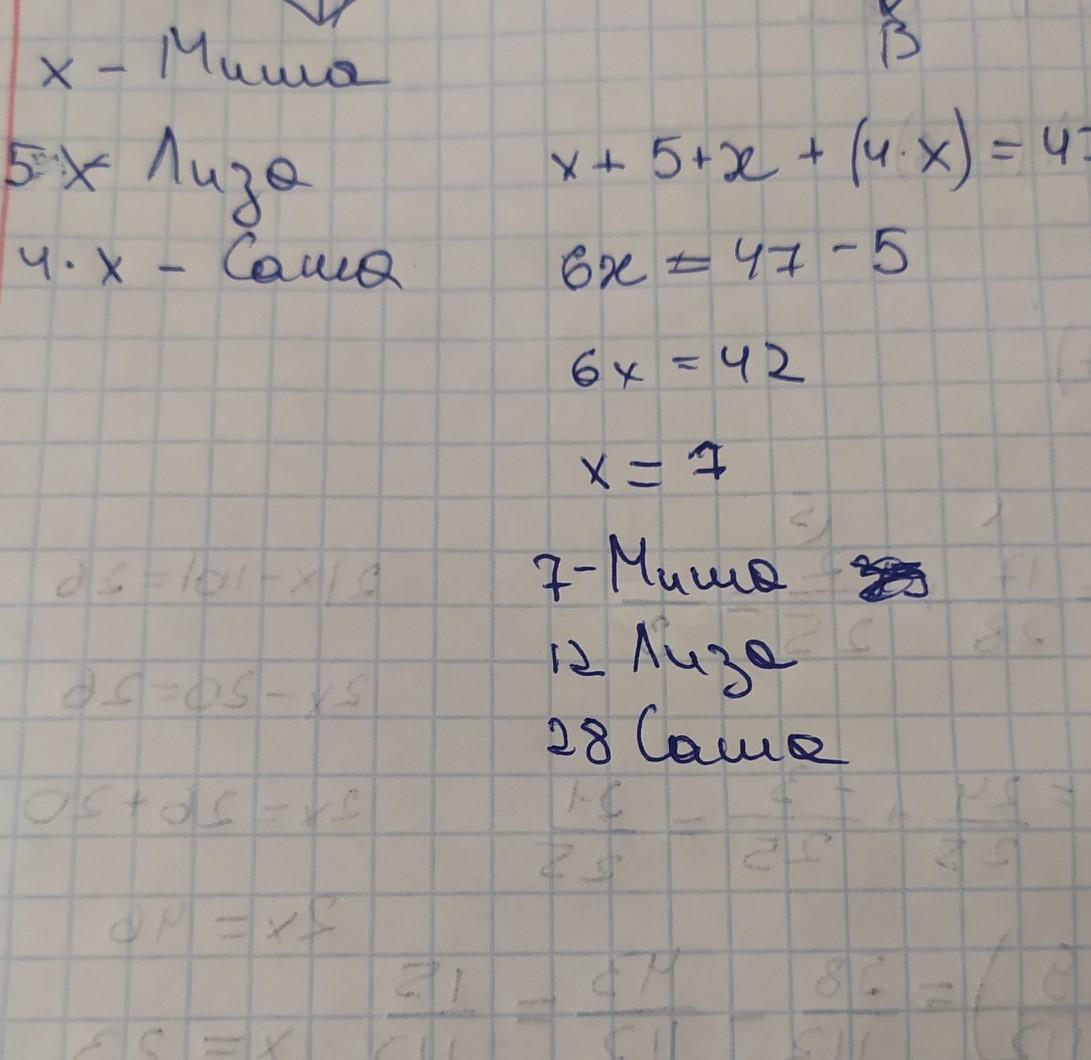 Миша — 7 шт., Лиза — 12 шт., Саша — 28 шт..
