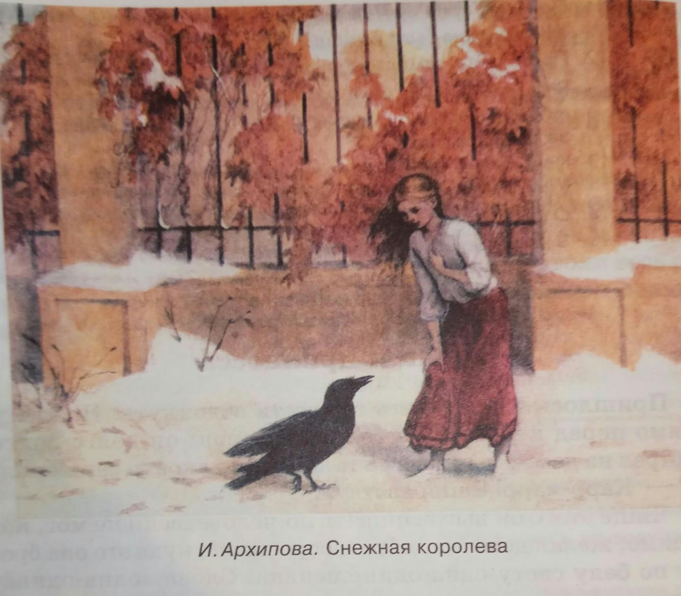 На этой картине изображена Герда, она встретила ворона, он был последним шансом на спасение Кая. На заднем плане изображён снег, холодно и морозно, а Герда в лёгкой одежде. Ворон изображён так, что можно понять, он внимательно слушает девочку. Ворон изображён яркими чёрными красками, что передаёт некую иллюзию и представление о уме и доброте ворона.