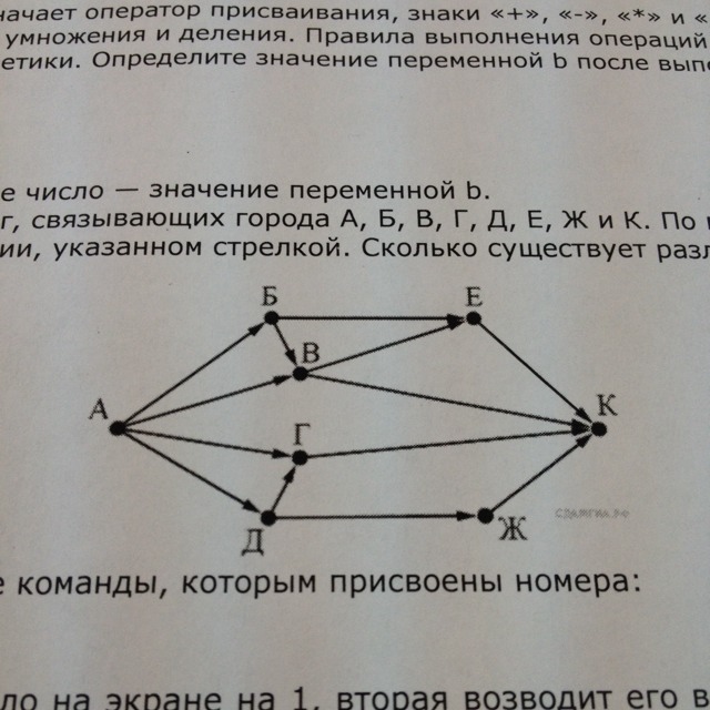 На рисунке - схема дорог, связывающих города А, Б, В, Г, Д, Е, Ж и К. По каждой дороге можно двигаться только в одном направлении, указанным стрелкой. Сколько существует путей из города А в город К?
