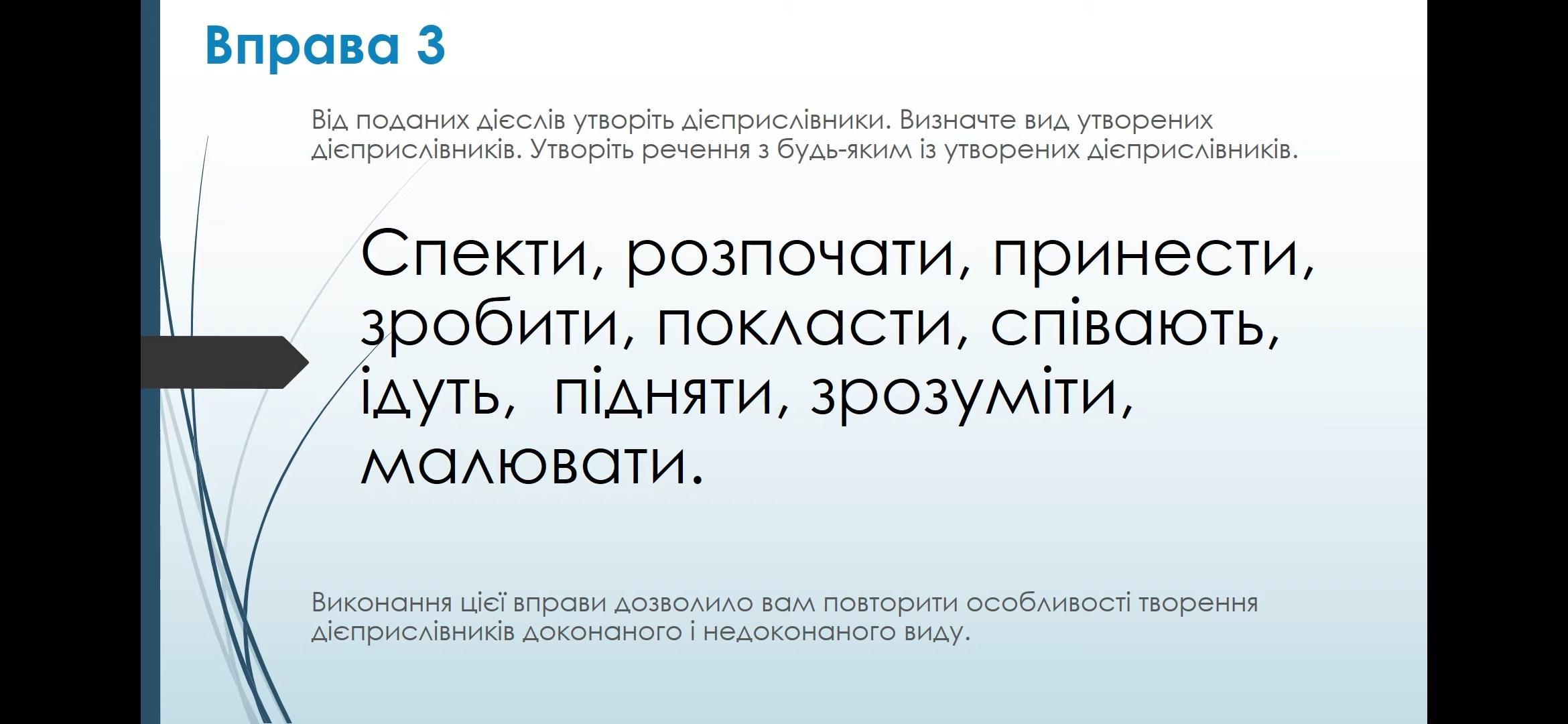 1. Спікши(доконаний вид), розпочавши(док), принісши(док), зробивши,(док) поклавши(док), співаючи(недок),ідучи(недок), піднявши(док), зрозумівши(док), малюючи(недок).
