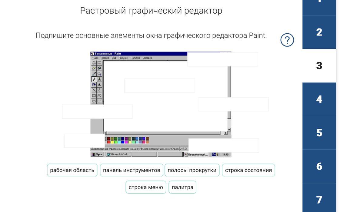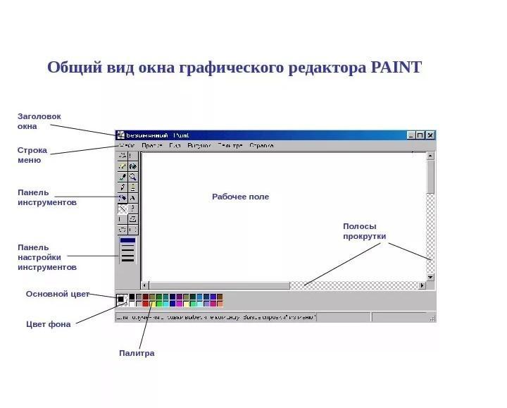Элементы окна редактора Paint: 1 – строка заголовка (имя файла рисунка и затем название редактора); 2 – строка меню (команды Файл, Правка, Вид, Рисунок, Палитра и Справка); 3 - панель инструментов.