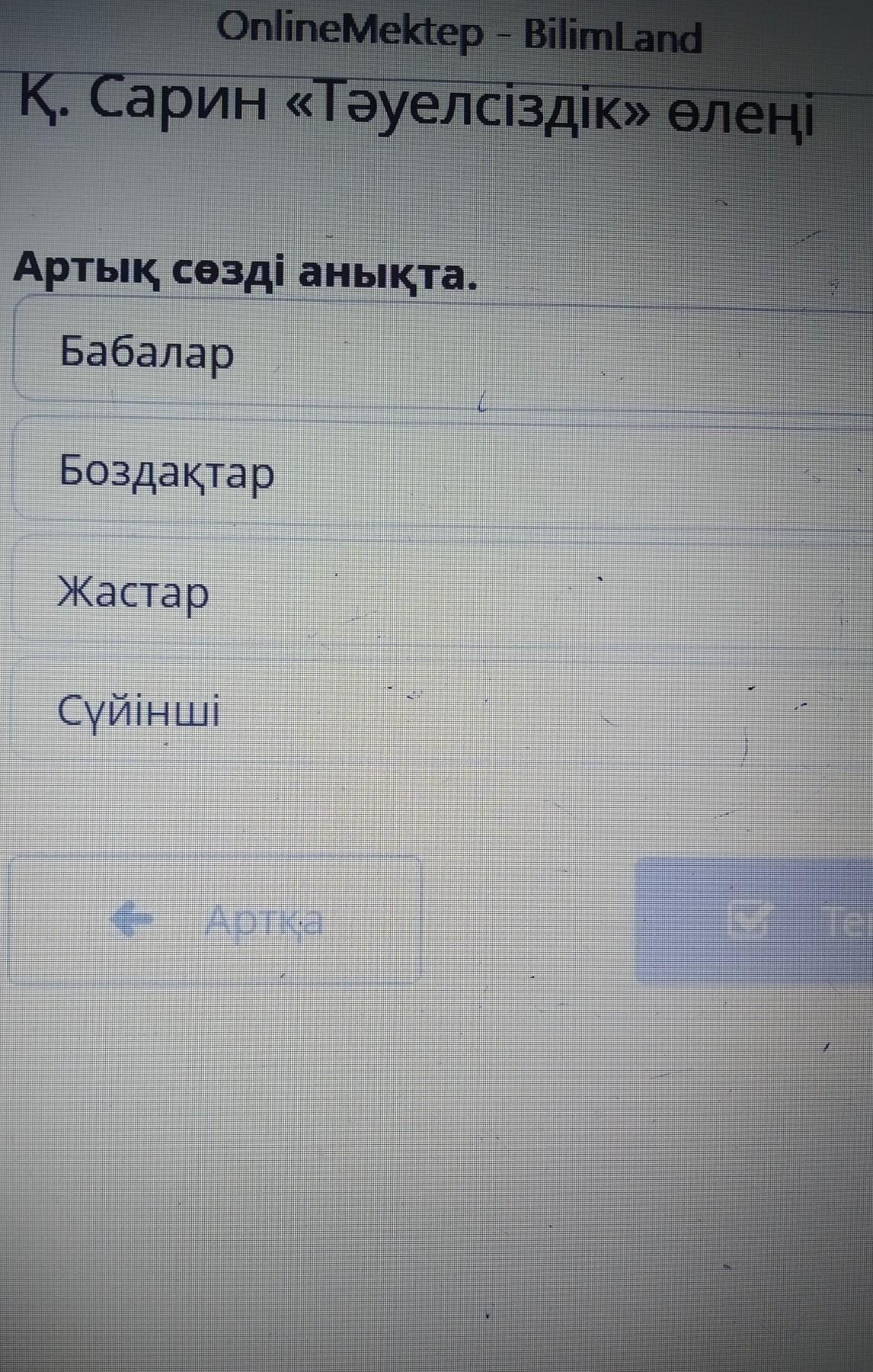 3 і 1К с Online Mektep - BilimLand Қ. Сарин «Тәуелсіздік» өлеңі 2 Артық сөзді анықта. Бабалар Боздақтар Жастар Сүйінші - Артқа 2 Тексеру