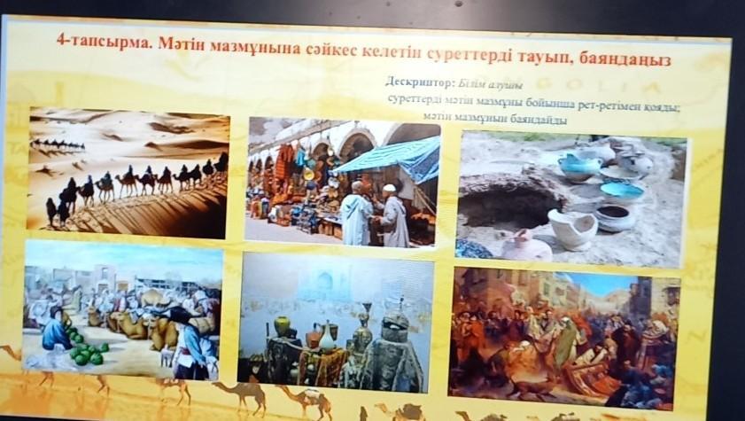 4-тапсырма. Мәтін мазмұнына сәйкес келетін суреттерді тауып, баяндаңыз Дескриптор: Білім алушы суреттерді мәтін мазмұны бойынша рет-ретімен жояды: мәтін мазмұнын баяндайды