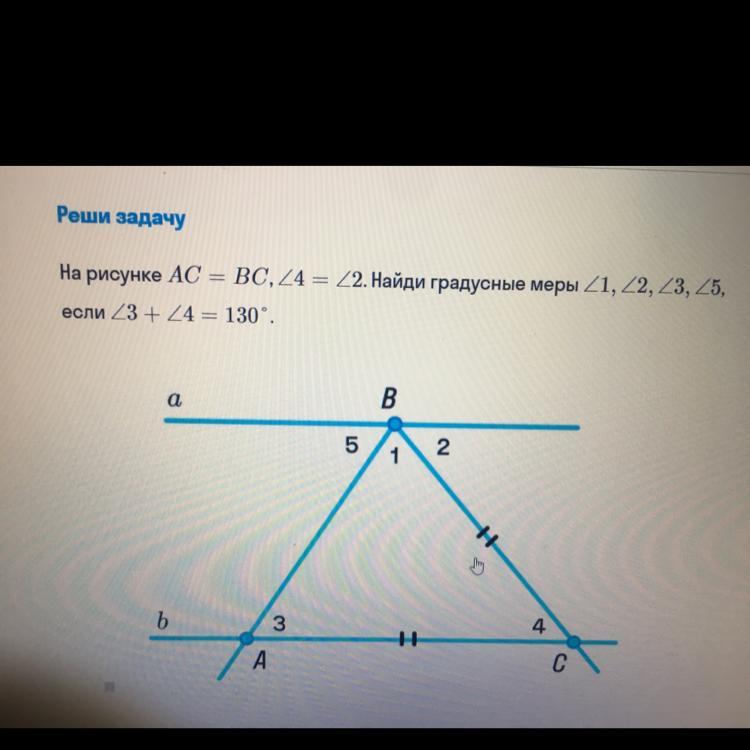 На рисунке AC = ВС, угол 4 = углу 2. Найди градусные меры угла 1, угла 2, угла 3, угла 5,