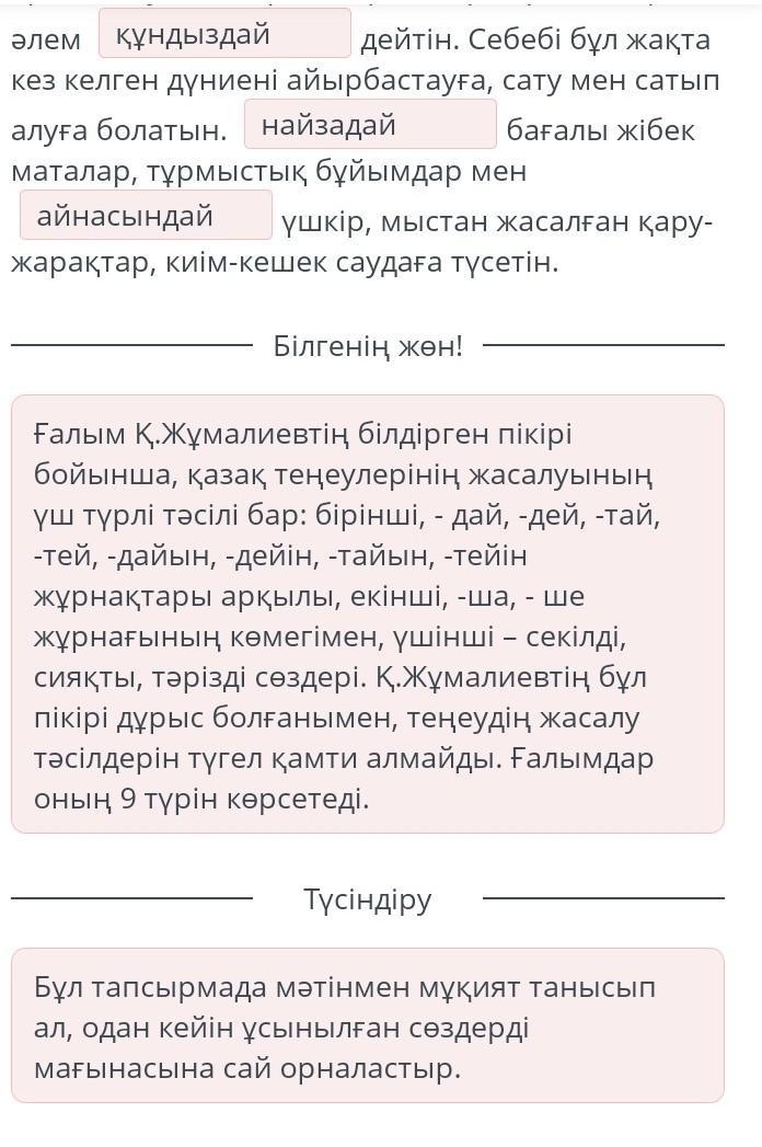 III х Ұлы Жібек жолы – әлемдік өркениет тарихындағы ұлы жетістік Теңеулерді мағынасына сай орналастыр. Ертеде сауда базарын көргендер Тараз базарын әлем дейтін. Себебі бұл жақта кез келген дүниені айырбастауға, сату мен сатып алуға болатын. бағалы жібек маталар, тұрмыстық бұйымдар мен үшкір, мыстан жасалған қару-жарақтар, киім- кешек саудаға түсетін. С Тексеру