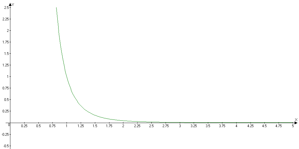 по осям не пересекается никогда, т.к. х не может быть 0, то и у тоже 0 не будет