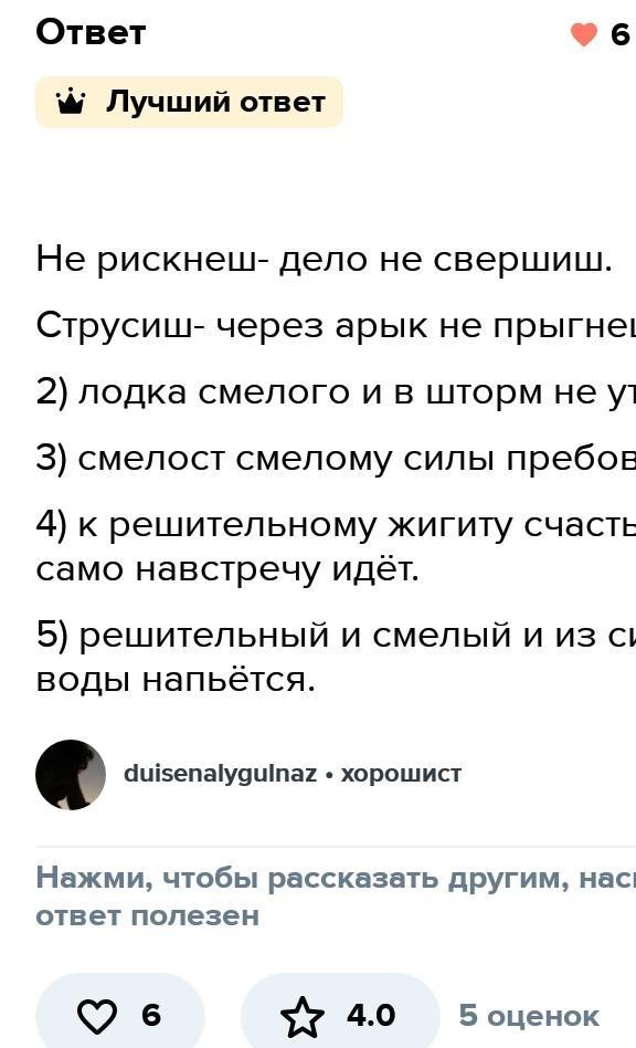 Соберите казахские пословицы, соединивслова в первом столбикесо словами во втором. Объясни их смысл Не рискнёшь дело не свершишь, силы прибавляет Лодка смелого счастье само навстречу идет. Смелость смелому жка сита воды напьётся. К решительному жиекту струсь - через арык не прыгнень Решительный и смелый и в шторм не утонет.