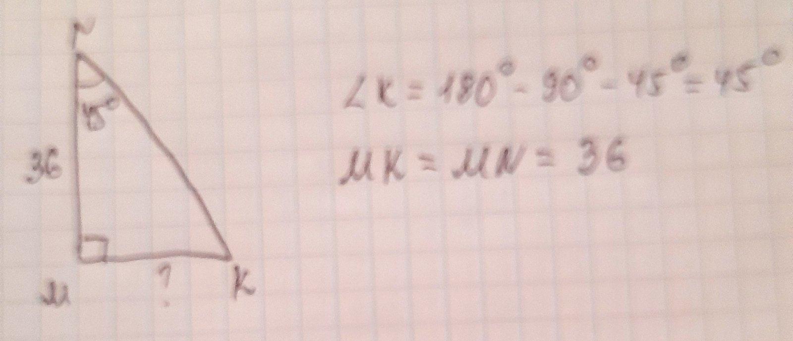 В треугольнике MNK M = 90, N = 45 , MN =36. Чему равна сторона MK ??